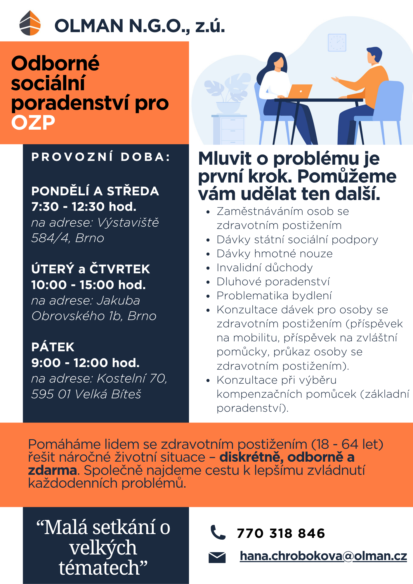 · Konzultace dávek pro osoby se zdravotním postižením (příspěvek na mobilitu, příspěvek na zvláštní pomůcky, průkaz osoby se zdravotním postižením).