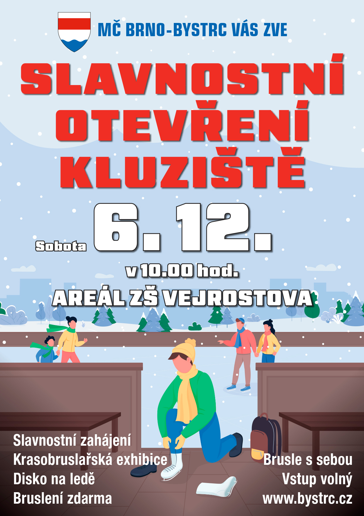 Milí Bystrčáci, zima je tady a s ní i čas nazout brusle! Přijďte s námi oslavit slavnostní otevření nového kluziště v sobotu 6. 12. v areálu ZŠ Vejrostova.
